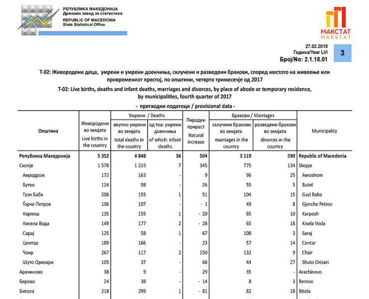 Според бројките во дури 32 општини во Македонија во последното тримесечје од 2017 година имало повеќе умрени лица отколку живородени деца, а најновите податоци на Државниот завод за статистика откриваат дека во речиси сите поголеми македонски градови со ретки исклучоци има негативен прираст на населението. Единствени градови во кои има повеќе живородени отколку умрени лица во последните месеци од 2017 година се Скопје, Тетово, Струга и Гевгелија.