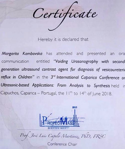 На покана на организаторите на конференцијата, свое предавање одржа и д-р Маргарита Камбовска, специјалист-педијатар во Болница „Плодност“, на тема „Микциона уросонографија со второгенерациски контраст (Sonovue) за дијагноза на везикоуретерален рефлукс: прва пилот студија“.