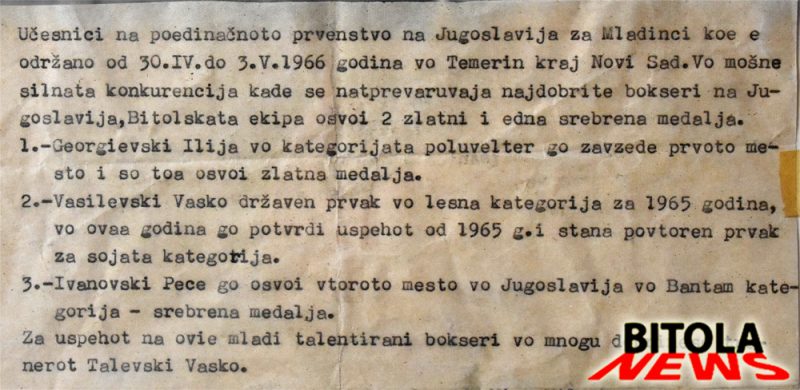 -Учесници на поединечното првенство на Југославија за Младинци кое е одржано од 30.4 до 3.5.1966 година во Темерин крај Нови Сад. Во мошне силната конкуренција каде се натпреваруваја најдобрите боксери на Југославија, Битолската екипа освои 2 златни и една средбрена медалја.