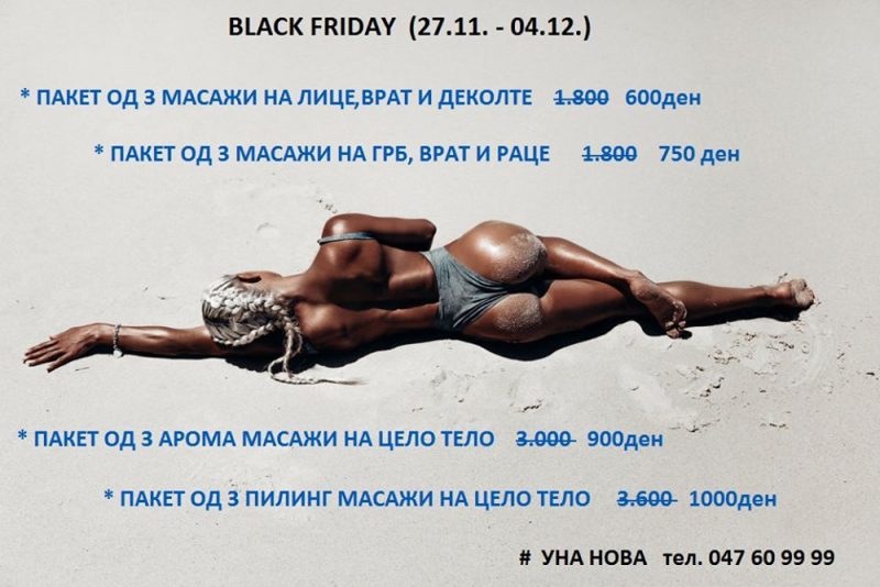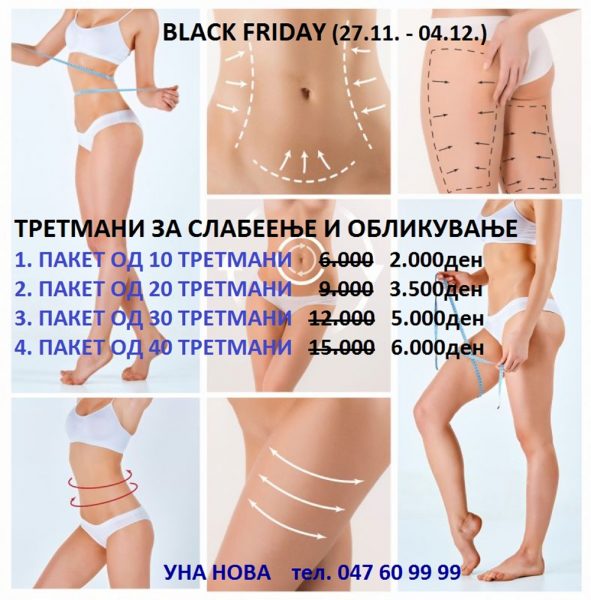 Последната недела на ноември односно последниот петок трендот на попусти го зафати и нашиот град. Козметичкиот салон “Уна Нова“ нуди многу попусти и понуди на пакети за “Black Friday week“ и од таму препорачуваат:-Нудиме ваучери кои сите заинтересирани можат да ги купат за  “Black Friday week“ поточно до 4 декември, но да ги искористуваат до одреден период понатаму и тоа до  1  март, заради искористувањето на пакетите кои имаат и до 10 третмани. Имено поради  големата заинтересираност и закажување на голем број термини за сите кои сакаат да се негуваат  ние ги објавуваме и информираме за нашите понуди и услуги преку вашиот медиум, и на  нашата ФБ страна. На нашиот телефон  можат да се информираат и да купат ваучер за себе или за подарок.Со искуствата од минатата година, а  и попустите кои ги нудиме во одредени денови, информираме дека  клиентките можат да си купат ваучер за поволна сума и да се негуваат и разубавуваат во одреден период во зависност од бројот на третмани од пакетот се до месец 1 март.  Искористете  “Black Friday week“ во “Уна Нова“ купете ваучери и по поволни цени може да се негувате со  третмани за слабеење, масажи, нега на лице, педикир и солариум.Со  поволни цени на третмани направете нега на лице и  тело.  Искористете ги за нега и убавина пред и после новогодишните празници кои ни се ближат.