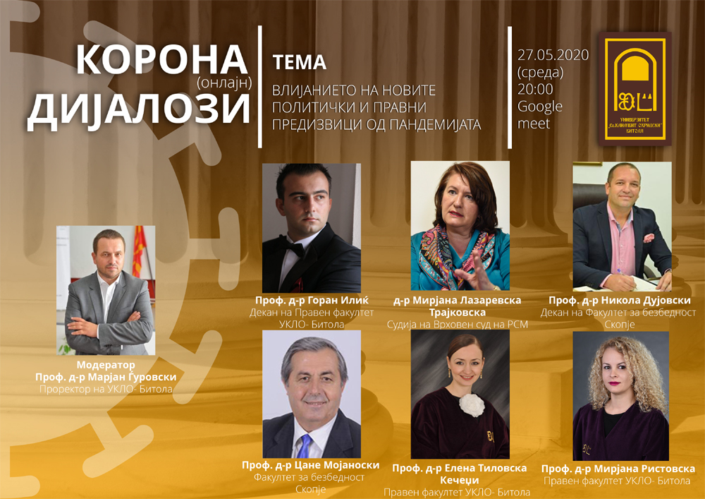 Во функција на новонастаната ситуација и оддржување на духот и мотивот кај студентите и професорите на Универзитетите, се оддржува серијалот на активности во овој период со кој непосредно се остварува влијание во справувањето со новите предизвици и креирањето на јавните политики чија промена е нужна, но и за правните обврски и последници од нивната примена по завршување на вонредната состојба смета иницијаторот и модератор на овие дијалози проректорот на УКЛО проф. д-р Марјан Ѓуровски професор на Факултетот за безбедност-Скопје.