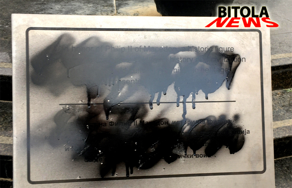 Ноќеска е оштетена, исчкртана со црн спреј, новата метална табла која беше поставена вчера, согласно договорот од Преспа, во споменичниот комплекс, пред споменикот на Филип II, на плоштадот “Магнолија“ во Битола.
