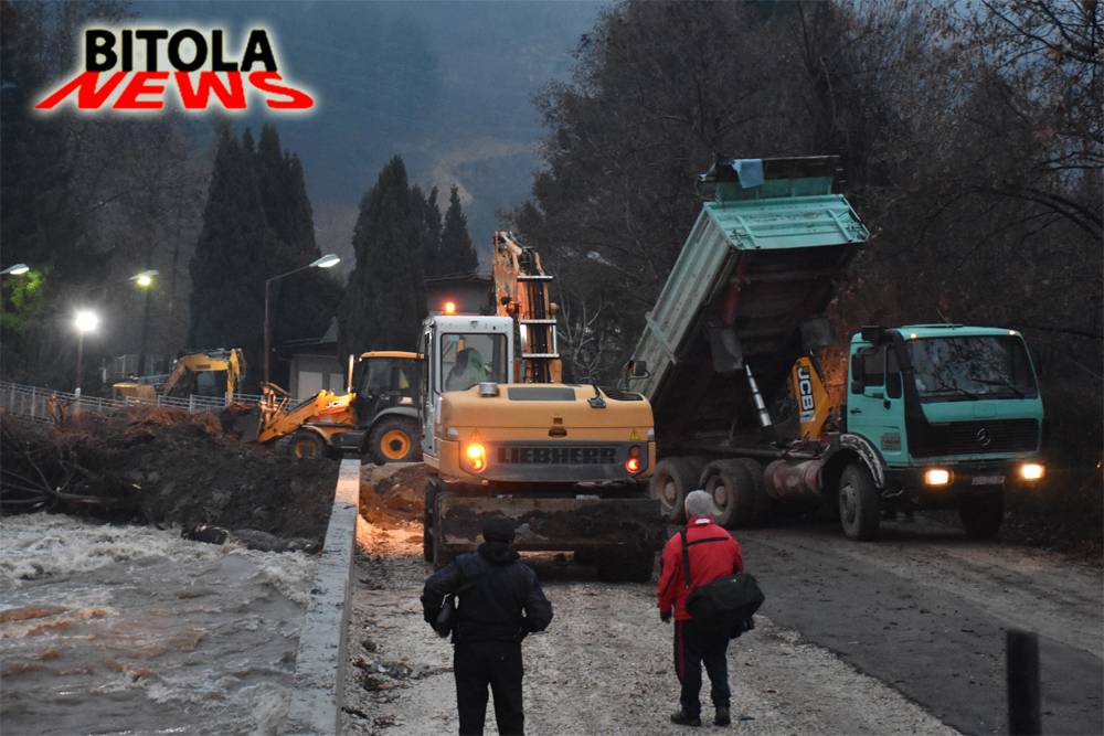 Екипи на јавните претријатија од Битола со градежна механизаци и камиони, како и механизација од приватни компании се уште се на терен и работат на обездување на коритото на реката Драгор, кај базенот кај населбата Довлеџик. Градежна механизација на местото каде што е одронот, под новиот потпорен зид го санира коритото на реката со распределување на материјалот, градежен шут и друго што го носат камионите кои чекаат на ред да истоварат.