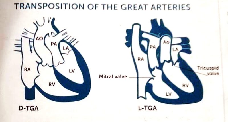 Чести аномалии поврзани со L-TGA и D-TGA се вентрикуларен септален дефект, трикуспидални абнормалности, регургитација ебштајнова аномалија, митрални валвуларни абнормалности дисплазија, повеќе кусписи итн.