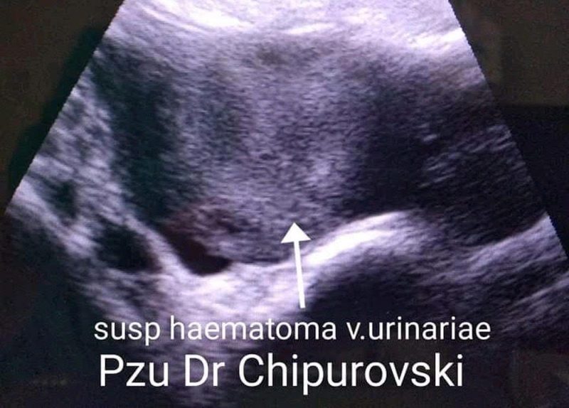 -Хематома во мочниот меур претставува лезија на колекција на крв и е најчесто предизвикана од повреда – траума надворешна или за време на гинеколошки хирушки интервенции, поретко од примена на зрачење во случаи на иноперабилни малигнитети во мала карлица. Клиничката презентација е со силни болки супрапубично, хематурија и дисурија болно и нарушено, мокрење, малаксаност. Лаборатороски треба да бидат испитана комплетна крвна слика, седимент на мокрача, CRP итн.