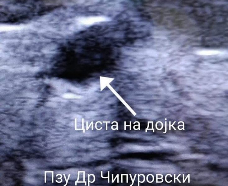 -Цистите на дојка се едни од најчестите наоди кај жени после 35 годишна возраст. Етиолошки се претпоставува да варијациите во естрогенот влијаат врз појавата на проширување на млечните канали и оформување на вреќички исполнети со течност, цисти зголемени пред менструација и намалени по димензии потоа. При ехо на дојки цистите се најчесто единечни поретко мултипли, aнехогени овални по форма со јасни маргини, уни или билатерални во поретки случи можи да има двојно лушпеста обвивка и формирање на абсцес како компликација кога е потребна хирушка дренажа и антибиотски третман, доколку се хипоехогени со хиперехогени точкеста внатрешност кај жени во лактација се работи за Галактокела.