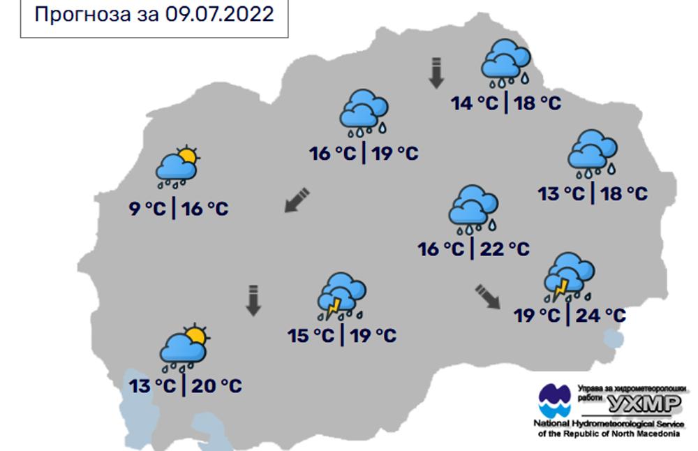 Денес, сабота, 9 јули, во Битола, според прогнозите на метеоролозите на Управата за хидрометеоролошки работи, времето ќе биде претежно облачно со врнежи од дожд, проследени со грмежи и со услови за појава на град. Ќе дува умерен до засилен северен ветер и температурата значително ќе опадне. Температурата во Битола до 19 степени.