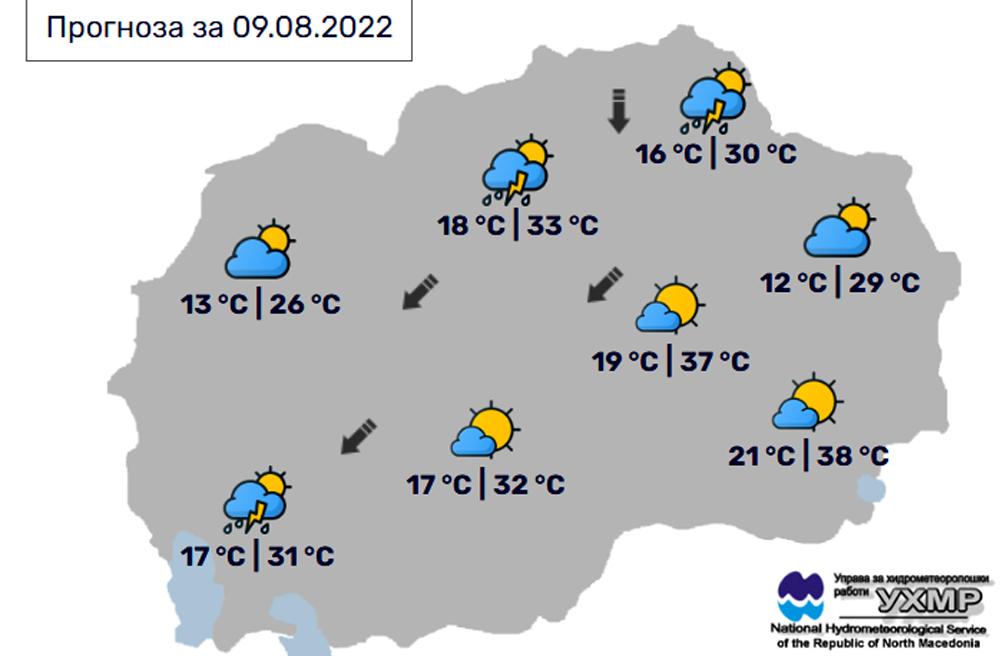 Денес, вторник, 9 август, во Битола, според прогнозите на метеоролозите на Управата за хидрометеоролошки работи, времето ќе биде претпладне сончево со мала до умерена облачност. Попладне со можност за нестабилност. Температурата во Битола до 32 степени. УВ=8.