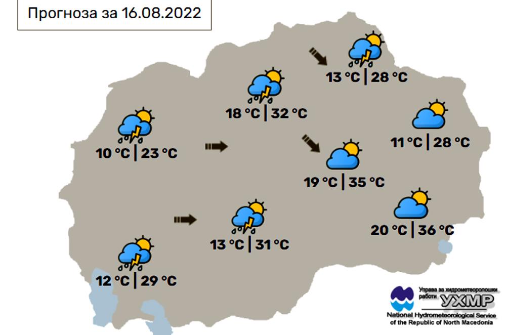 Денес, вторник, 16 август, во Битола, според прогнозите на метеоролозите на Управата за хидрометеоролошки работи, времето ќе биде сончево со мала до умерена локална облачност. Во попладневните часови ќе има услови за нестабилност со пороен дожд и грмежи. Температурата во Битола до 31 степен.