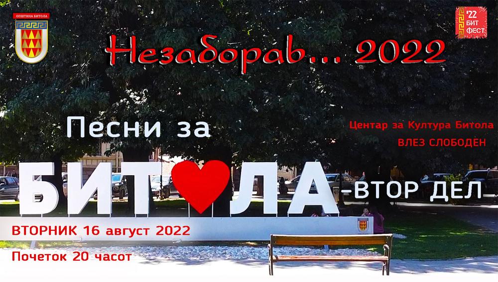 Во рамките на Бит фест 2022, денес, 16-ти август 2022 год. во Центарот за култура – Битола со почеток во 20.00 часот, по 12-ти пат ќе се одржи манифестацијата „Незаборав“ песни за Битола – втор дел.