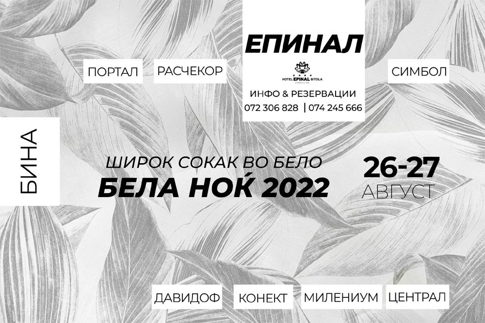 Хотел “Епинач“ ве информираме дека на 10. издание на “Широк Сокак во бело – БЕЛА НОЌ“ која ќе се одржи во петок 26 август, и сабота 27 август хотел “Епинал“ има свој шанк на плоштадот “Гоце Делчев“.