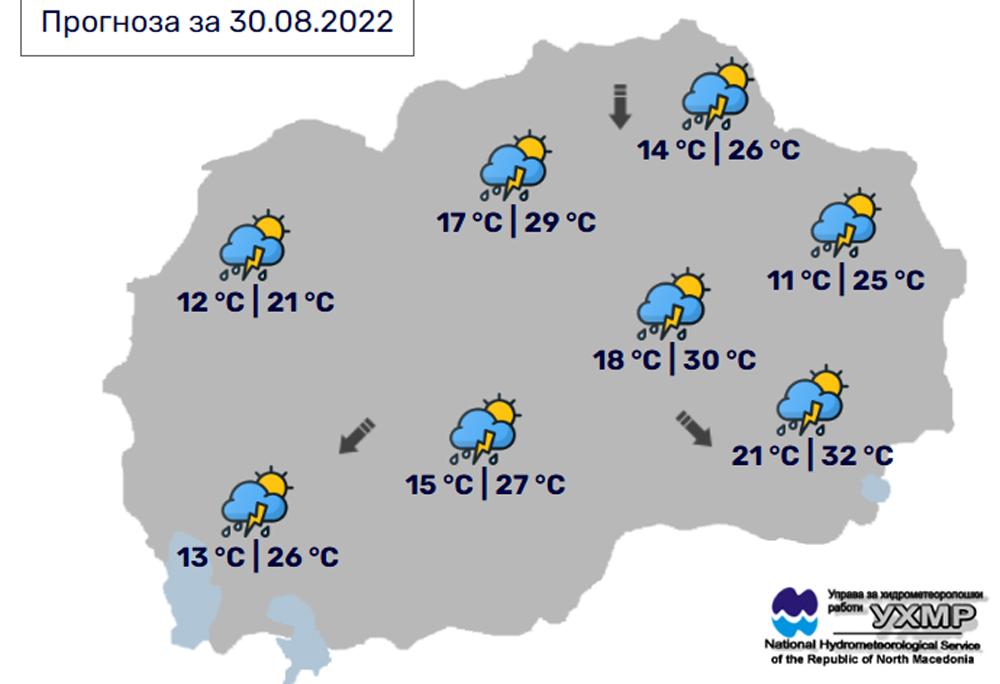 Денес, вторник, 30 август, во Битола, според прогнозите на метеоролозите на Управата за хидрометеоролошки работи, времето ќе биде променливо облачно, од пладневните часови нестабилно со пороен дожд, грмежи и засилен ветер. Температурата во Битола до 27 степени.