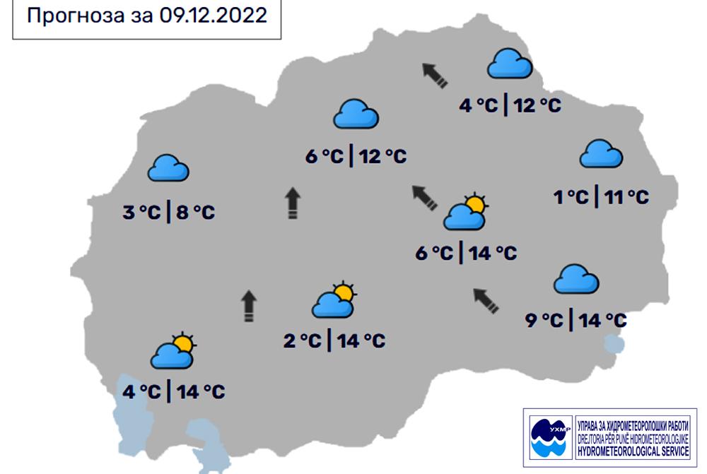 Денес, петок, 9 декември, во Битола, според прогнозите на метеоролозите на Управата за хидрометеоролошки работи, времето ќе биде променливо облачно. Ќе дува умерен до засилен ветер од југоисточен правец. Температурата во Битола до 14 степени.
