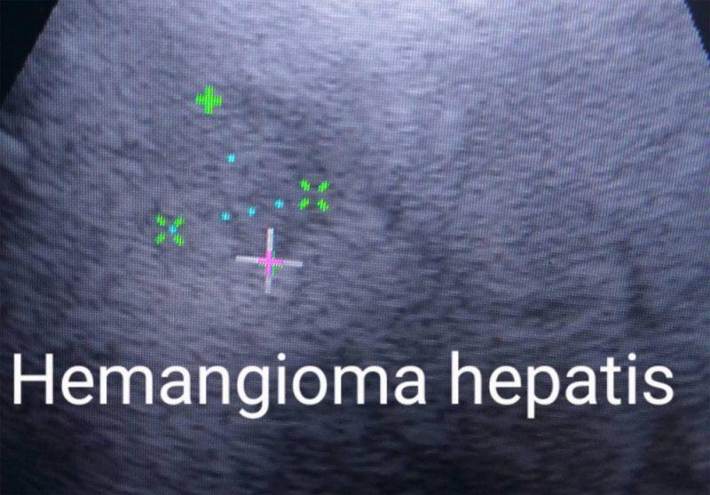 Ултрасонографски се карактеризира со хиперехогени ехотекстура “snow ball“, овална форма јасно граници без хипоехогено полусрпесто “хало“ карактеристично за метастазите. Потреба од хируршко отстранување на хемангиомите  има само  доколку се зголемуваат, крварат доколу има промена во формата.