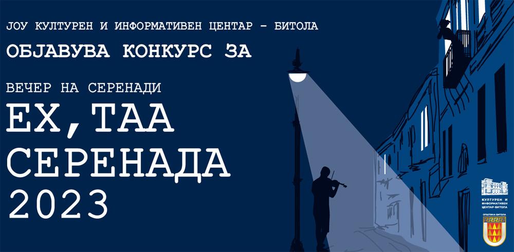 Културен и информативен центар – Битола објавува конкурс, со траење од 01.02.2023 до 31.03.2023, за 14 нови композиции за потребите на фестивалот на битолската серенада “Ех таа серенада” 2023 . Композициите треба де се во согласност со досегашните принципи на компонирање на музика и пишување на текстови во корелација со староградската музика, со потенцирање на битолската серенада како основен уметнички израз. Сите варијации и иновации на оваа тема се добредојдени за збогатување на квалитетот на оваа музичка форма. Музичките дела ги очекуваме како демо снимка во mp3 формат, аплициран текст, и/или нотен запис на мелодиската линија со запишани акорди на нашата електронска адреса serenadakicbt@gmail.com.