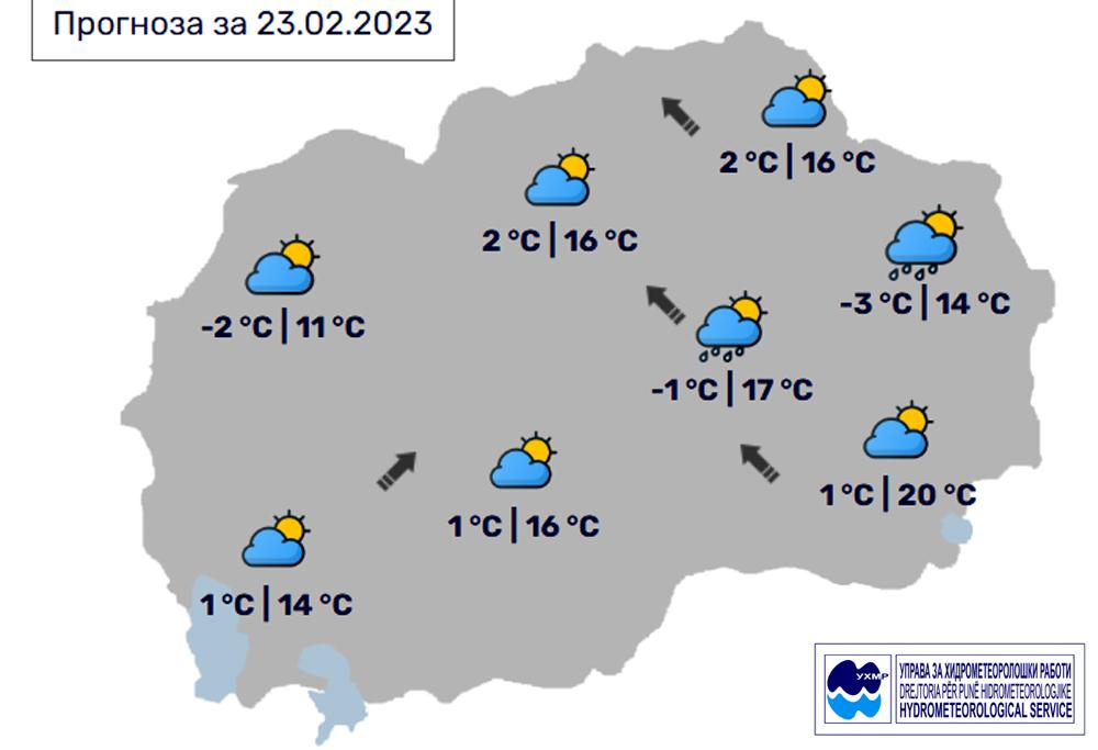 Денес, четврток, 23 февруар, во Битола според прогнозите на метеоролозите на Управата за хидрометеоролошки работи, времето ќе биде сончево со мала до умерена облачност. Ќе дува слаб до умерен ветер од јужен правец. Температурата во Битола до 16 степени.