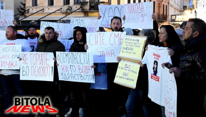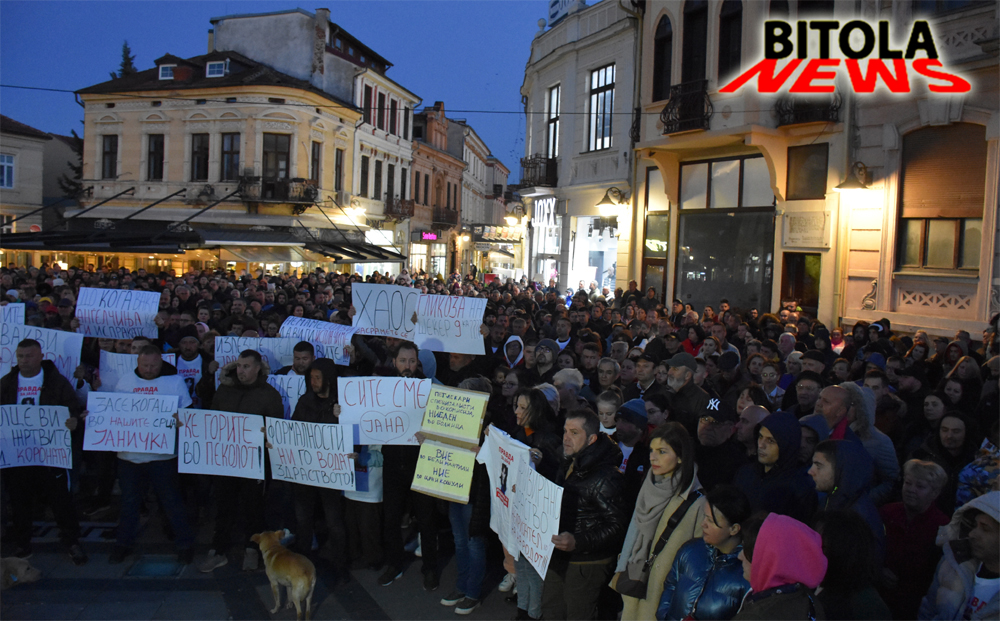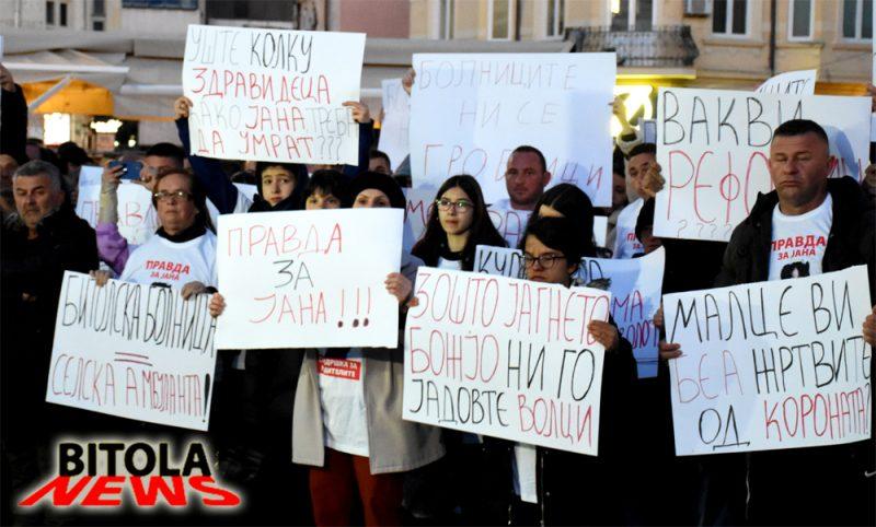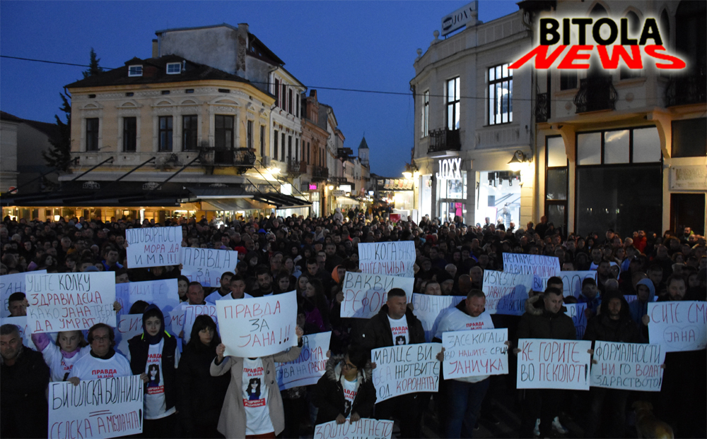 Битолчани го исполнија плоштадот “Магнолија“ голем број на транспаренти, “Секогаш во нашите срца Јаничка“, “Малце се ли жртвите од короната“, “Сите сме Јана“, “Немаме солзи да ви ги исплачиме гревовите“…, а запрашаа “уште колку здрави деца како Јана треба да умрат?“
