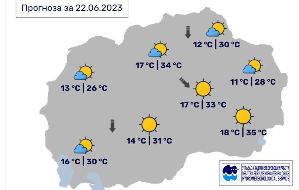 Денес, четврток, 22 јуни, во Битола, според прогнозите на метеоролозите на Управата за хидрометеоролошки работи, времето ќе биде сончево и топло. Ќе дува слаб до умерен ветер од северен правец. Температурата во Битола до 31 степен. UV = 8