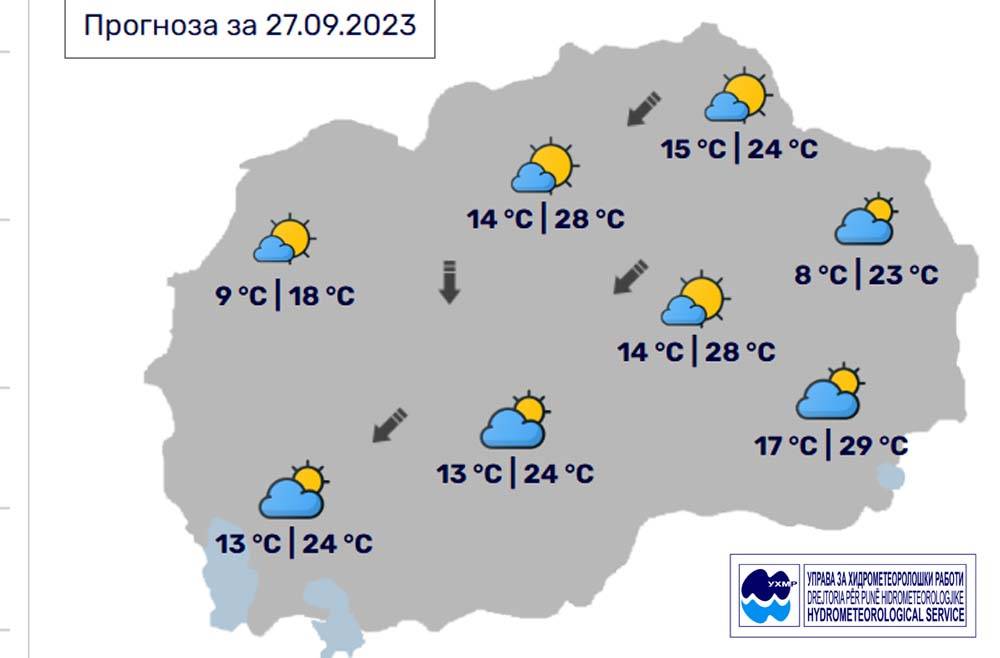 Денес, среда, 27 септември, во Битола според прогнозите на метеоролозите на Управата за хидрометеоролошки работи, времето ќе биде сончево со значителна облачност. Ќе дува слаб до умерен ветер од североисточен правец. Температурата во Битола до 24 степени.