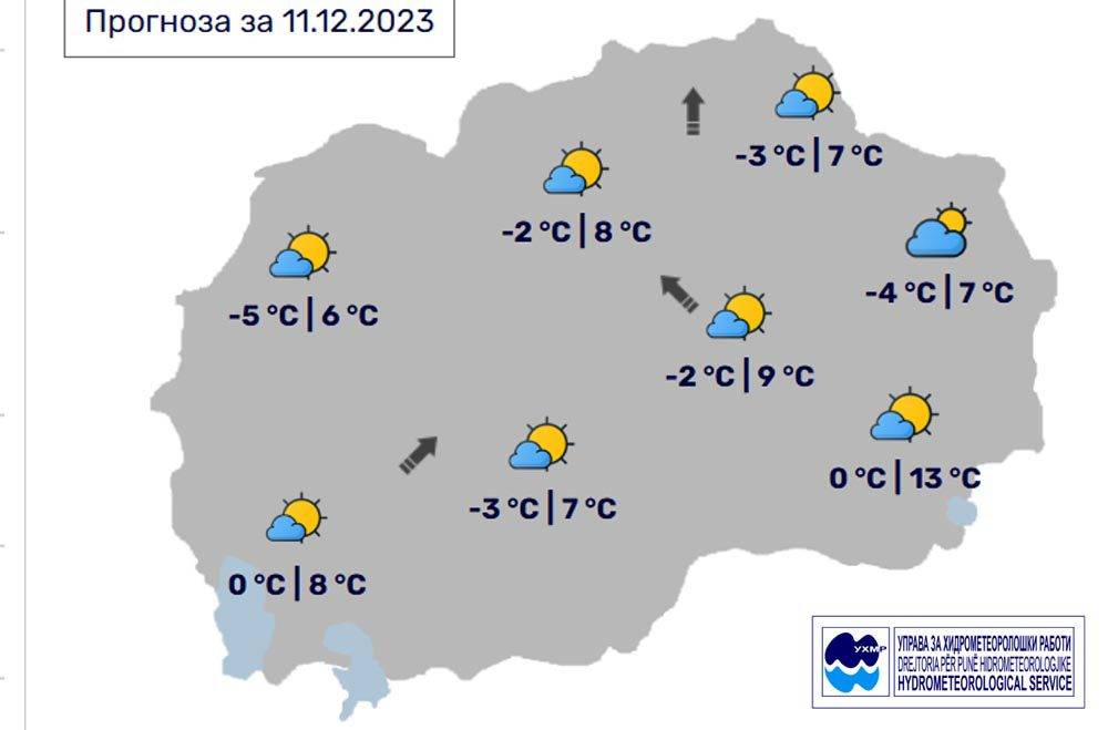 Денес, понеделник, 11 декември, во Битола според прогнозите на метеоролозите на Управата за хидрометеоролошки работи, времето ќе биде сончево со мала облачност, а кон крајот на денот облачноста ќе се зголеми. Ќе дува слаб до умерен ветер од јужен правец. Температурата во Битола до 7 степени.