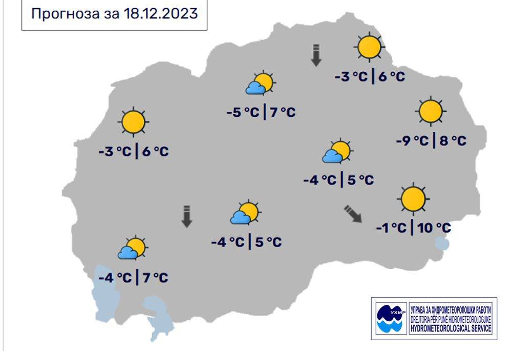 Утре, вторник, 19 декември, во Битола времето ќе биде наутро студено, а преку денот сончево. По одделни котлини ќе има услови за појава на утринска магла или ниска облачност. Ќе дува слаб до умерен ветер од северен правец. Температурата во Битола до 7 степени.