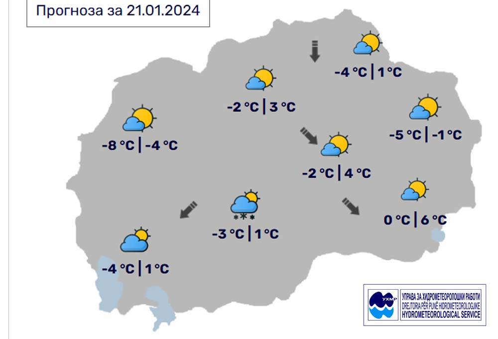 Утре, понеделник, 22 јануари во Битола времето ќе биде наутро ведро, тивко и многу студено, преку денот сончево со мала до умерена локална облачност. Температурата во Битола до 1 степен, а минималната до -16 степени.