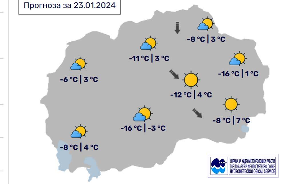Денес, вторник, 23 јануари, во Битола, според прогнозите на метеоролозите на Управата за хидрометеоролошки работи, времето ќе биде по студеното утро, преку денот сончево со мала до умерена облачност. Попладне ќе дува слаб до умерен северен ветер. Температурата во Битола до -3 степени.