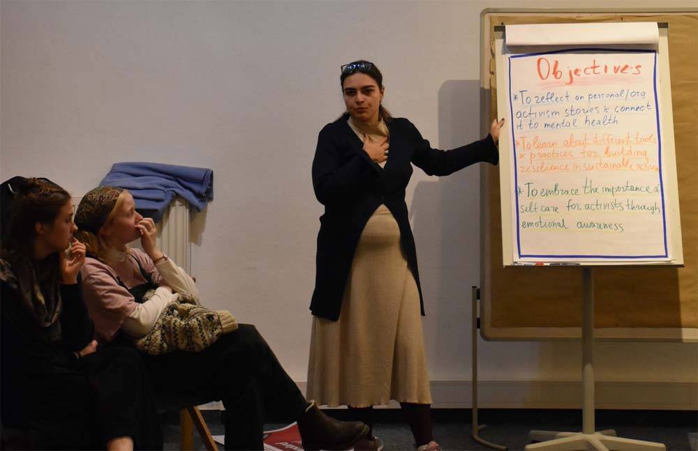 За време на обуката учесниците играа игри за да се запознаат меѓусебе, имаа вежби за градење на тимови и активна сесија при која имаа можност да ги споделат своите лични приказни и патувања како активисти. Обуката, исто така, вклучуваше вежби за тоа како да се поврзе менталното здравје со активизмот, како главна тема на интерес, заедно со време за рефлексија околу спроведените активности и работа на темата “искористување на нашиот внатрешен мир“.