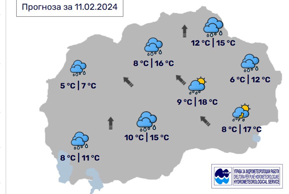 Денес, недела, 11 февруари, во Битола според прогнозите на метеоролозите на Управата з хидрометеолошки работи, времето ќе биде променливо облачно со повремени врнежи од дожд. Ќе дува умерен ветер од југоисточен правец. Максималната температура во Битола ќе биде  до 15 степени.
