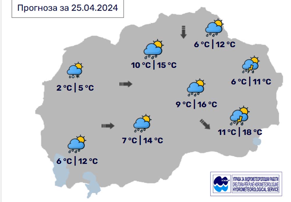 Денес, четврток, 25 април, во Битола според прогнозите на метеоролозите на Управата за хидрометеоролошки работи времето ќе биде променливо облачно со повремени врнежи од дожд. Ќе дува слаб до умерен ветер од северозападен правец. Температурата во Битола до 14 степени.