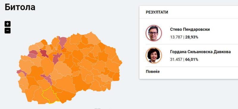 Државната изборна комисија по преброени 100 проценти од гласачки ливчиња во Битола од вкупно 170 гласачки места, ги објави првите неофицијални резултати од вториот круг од седмите по ред претседателски избори.Во Битола гласаа 47.657 лица. Вкупен број на важечки гласачки ливчиња 45.244. Вкупен број на неважечки гласачки ливчиња 2.413.Во Битола најмногу гласови, 31.457, освои Гордана Силјановска Давкова, кандидатот на ВМРО-ДПМНЕ и Коалицијата, или 66,01 проценти.Стево Пендаровски, кандидат за претседател на СДСМ и Коалицијата, освои 13.787 гласови, или 28,93 проценти.