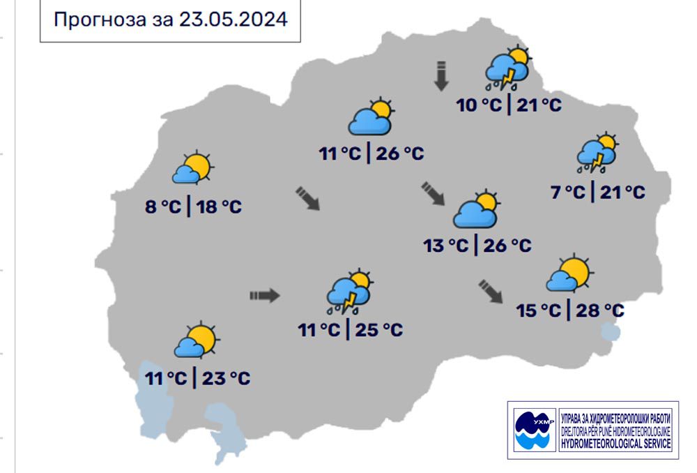 Денес, четврток, 23 мај, во Битола според прогнозите на метеоролозите на Управата за хидрометоролошки работи, времето ќе биде сончево и топло со мала до умерена облачност. Ќе дува слаб до умерен ветер од северозападен правец. Попладне можност за нестабилност со пороен дожд и грмежи. Температурата во Битола до 25 степени.