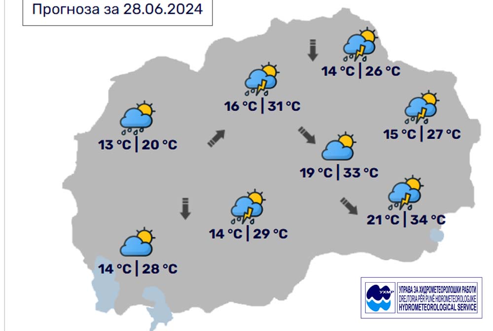 Денес, петок, 28 јуни, во Битола, според прогнозите на метеролозите на Управата за хидрометеоролошки работи, времето ќе биде променливо облачно со можен повремен пороен дожд и грмежи. Ќе дува слаб до умерен ветер од северен правец. Максималната температура во Битола до 29 степени. UV=7