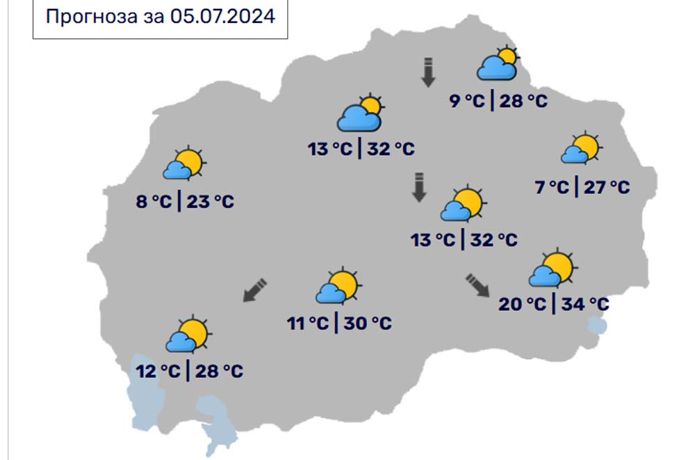 Денес, петок, 5 јули, во Битола според прогнозите на метеоролозите на Управата за хидрометеоролошки работи, времето ќе биде сончево и потопло. Ќе дува слаб до умерен ветер од северен правец. Температурата во Битола до 30 степени.