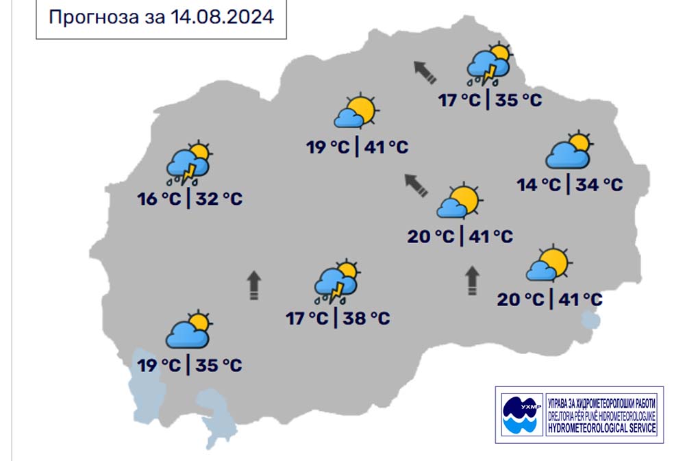 Денес, среда, 14 август, во Битола според прогнозите на метеоролозите на Управата за хидрометеоролошки работи, времето ќе биде сончево и многу топло. Ќе дува слаб до умерен ветер претежно од јужен правец. Попладне можност за пороен дожд. Максималната температура во Битола до 38 степени. УВ=8.