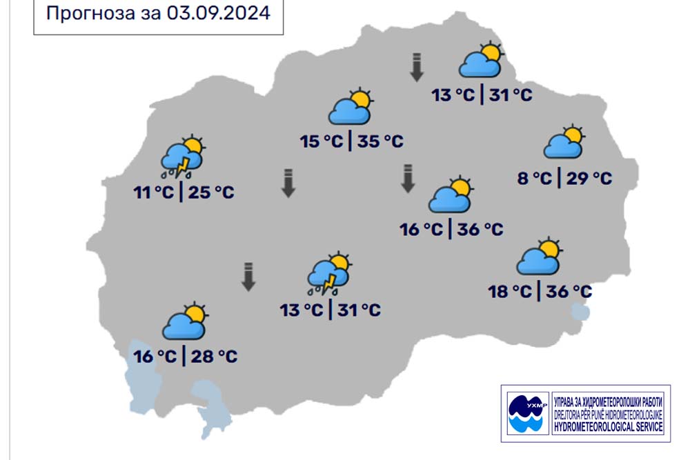 Денес, вторник, 3 септември, во Битола според прогнозите на метеоролозите на Управата за хидрометеоролошки работи, времето ќе биде сончево и топло со мала до умерена облачност и со слаб до умерен ветер од северен правец. Попладне можност за краткотраен пороен дожд и ретки грмежи. Температурата во Битола до 31 степен.