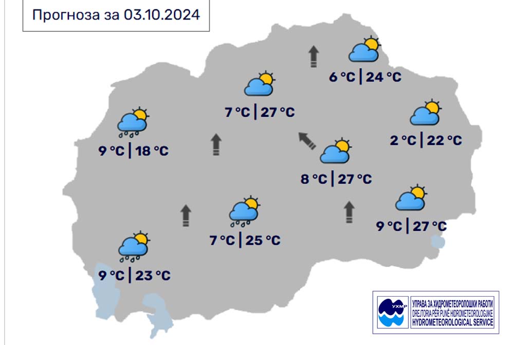 Утре, петок, 4 октомври, во Битола времето ќе биде променливо облачно со повремени врнежи од дожд, наместа пообилни, локално во форма на невреме, проследени со грмежи и засилен ветер. Температурата во Битола до 24 степени.