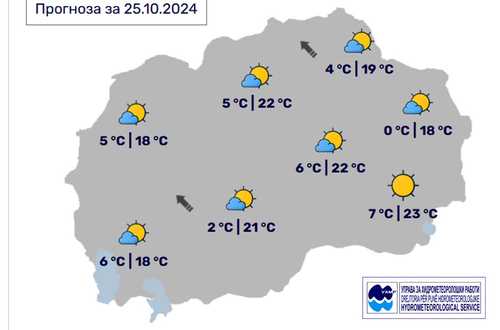 Денес, петок, 25 октомври, во Битола според прогнозите на метеоролозите на Управата за хидрометеоролошки работи, времето ќе биде сончево со мала облачност. Ќе дува слаб ветер од југоисточен правец. Температурата во Битола до 21 степен.