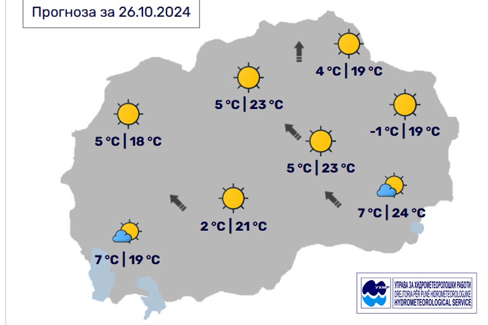 Денес, сабота, 26 октомври, во Битола, според прогнозите на метеоролозите на Управата за хидроетеоролошки работи, времето ќе биде сончево со мала облачност. Ќе дува слаб до умерен ветер од југоисточен правец. Температурата во Битола до 21 степен.