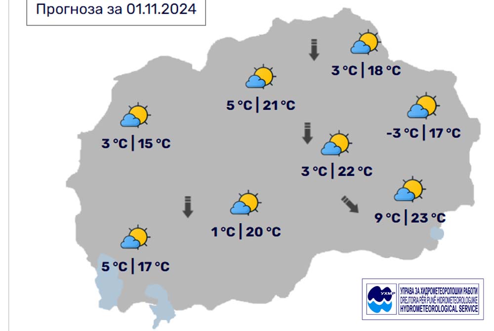 Денес, петок, 1 ноември, во Битола според прогнозите на метеоролозите на Управата за хидрометеоролошки работи, времето ќе биде Наутро по одделни котлини ќе има појава на магла или ниска облачност. Преку денот променливо облачно сончево. Ќе дува слаб до умерен ветер од северен правец. Температурата во Битола до 20 степени.