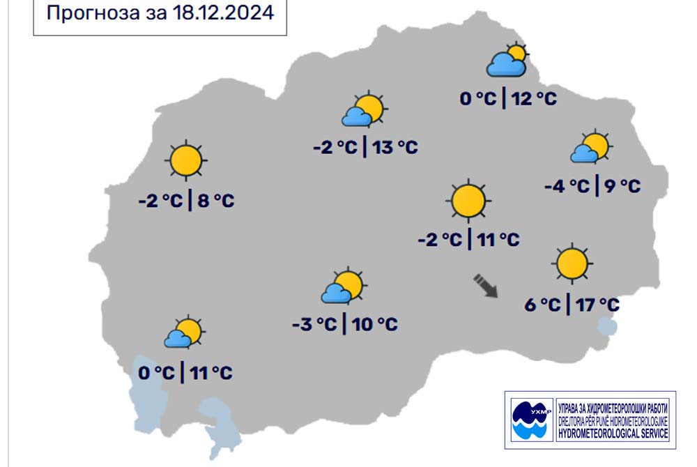 Денес, среда, 18 декември, во Битола според прогнозите на метеоролозите на Управата за хидрометеоролошки работи, времето ќе биде сончево со мала до умерена облачност поголема попладне. Ќе дува слаб ветер од северозападен правец. Температурата во Битола до 10 степени.