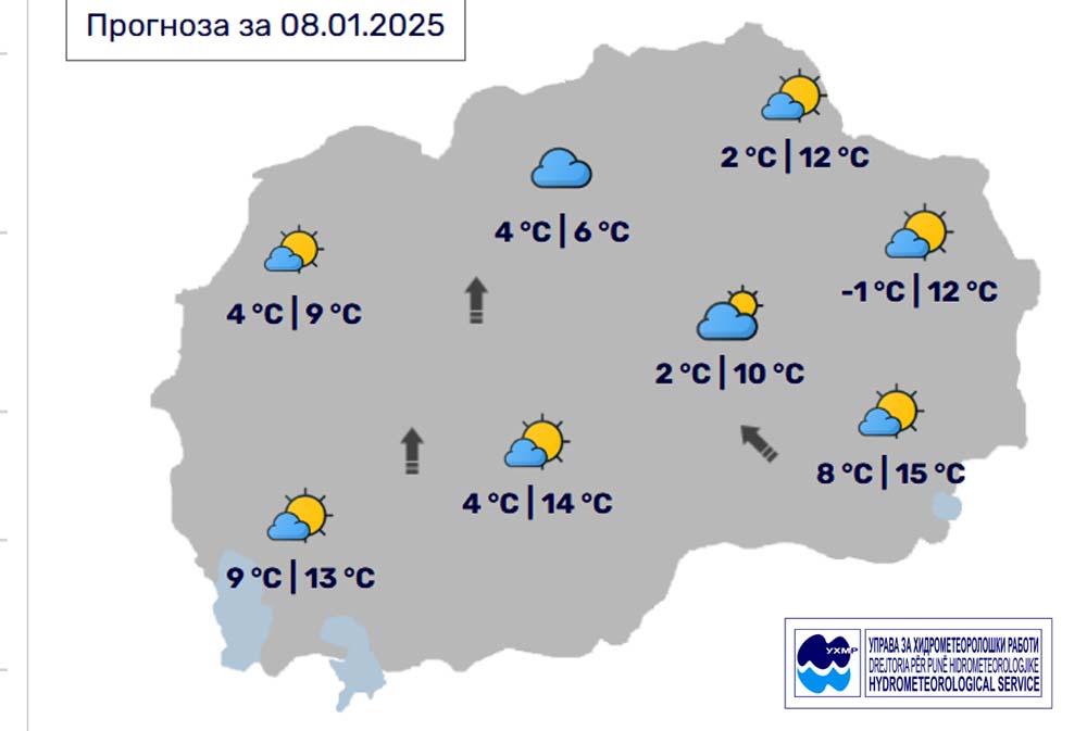 Денес, среда, 8 јануари, во Битола според прогнозите на метеоролозите на Управата за хидрометеоролошки работи времето ќе биде променливо облачно. Во текот на денот сончево и релативно топло со мала до умерена облачност и со слаб до умерен ветер од јужен правец. Температурата во Битола до 14 степени.
