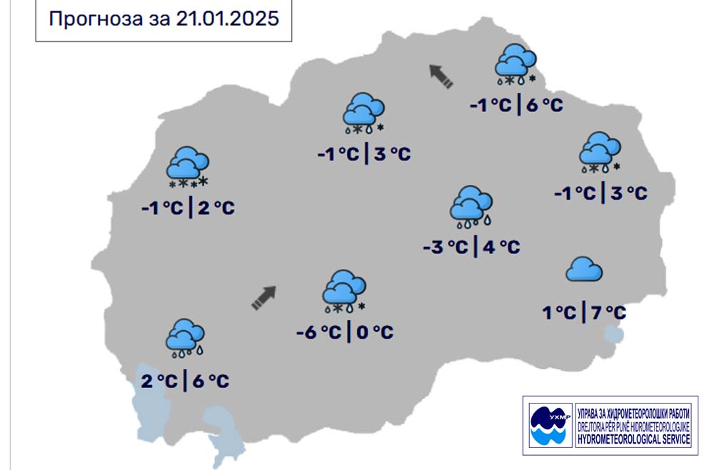 Денес, вторник, 21 јануари, во Битола според прогнозите на метеоролозите на Управата за хидрометеоролошки работи, времето ќе биде облачно со повремени врнежи од дожд. Врнежите ќе бидат со слаб интензитет. Максималната температура во Битола до 0 степени.