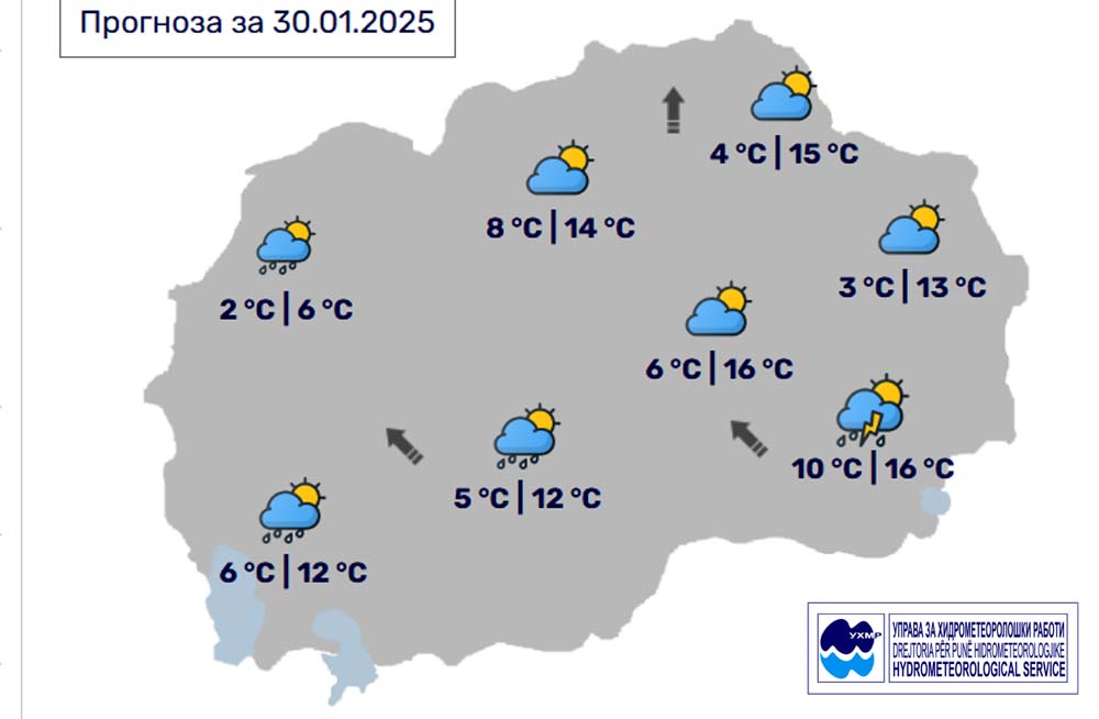 Денес, петок, 31 јануари, во Битола според прогнозите на метеоролозите на Управата за хидрометеоролошки работи, времето ќе биде променливо облачно со повремени врнежи од дожд. Ќе дува слаб до умерен ветер претежно од јужен правец. Температурата во Битола до 12 степени.