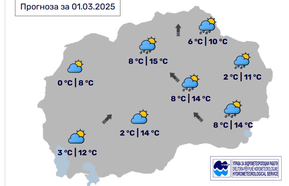 Денес, сабота, 1 март, во Битола според прогнозите на метеоролозите на Управата за хидрометеоролошки работи, времето ќе биде променливо облачно и релативно топло со повремен дожд. Ќе дува слаб до умерен ветер од јужен правец. Максималната температура во Битола ќе биде до 14 степени.