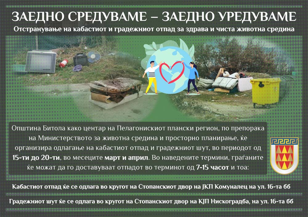 Општина Битола како центар на Пелагонискиот плански регион, по препорака на Министерството за животна средина и просторно планирање, ќе организира одлагање на кабастиот отпад и градежниот шут, во периодот од 15-ти до 20-ти март. Истата акција, која еднаш веќе беше спроведена во месец февруари, ќе продолжи и во месец април. Во наведените термини, граѓаните ќе можат да го доставуваат отпадот во терминот од 7-15 часот и тоа:
