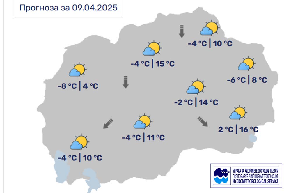 Денес, среда, 9 април, во Битола според прогнозите на метеролозите на Управата за хидрометеоролошки работи, времето ќе биде сончево со мала до умерена облачност. Ќе дува слаб до умерен ветер од северен правец. Максималната температура во Битола до 11 степени.