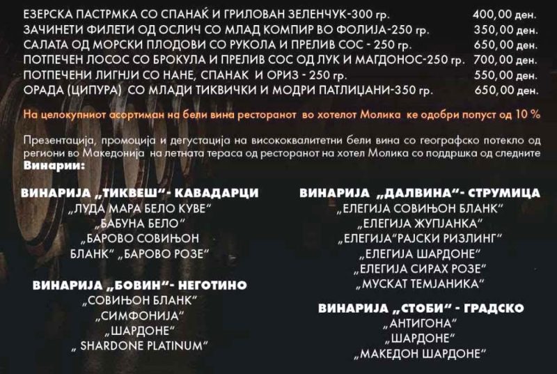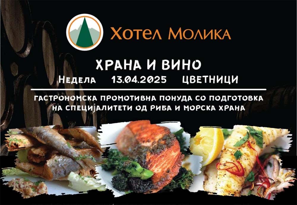 -Уживајте во специјално мени со свежа риба и морска храна, совршено спарени со внимателно одбрани вина, во пријатната атмосфера на нашиот ресторан во срцето на Баба Планина. Храна, вино, природа и празнична магија – сè на едно место!, порачуваат од хотел “Молика“.