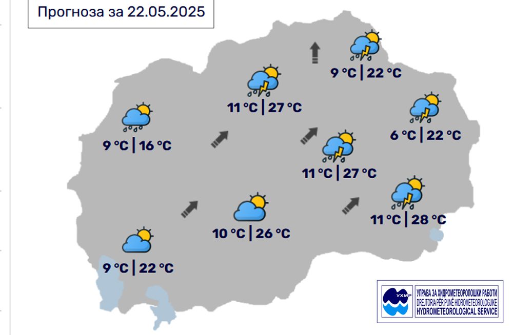 Денес, четврток, 22 мај, во Битола според прогнозите на метеоролозите на Управата за хидрометеоролошки работи, времето ќе биде променливо облачно и топло со сончеви периоди. Попладне можност за нестабилност со пороен дожд, грмежи и засилен ветер. Температурата во Битола до 26 степени.