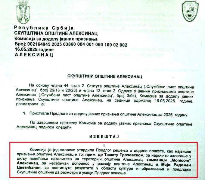 –Во последните години забележуваме значителен пораст на пациенти кои ни доаѓаат, по препорака, од Алексинац и пошироко од Србија, благодарение на резултатите што ги постигнуваме во областа на репродуктивната медицина и 3D лапароскопската хирургија, е напишано во извештајот на комисијата за доделување на награди на општина Алексинац, ја образложи Комисијата својата одлука.
